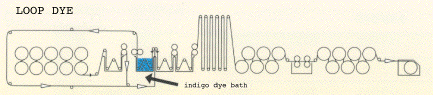Rope Dyeing: A group of undyed yarns (360 yarns) are twisted together and dyed as a single unit (rope like). This system allows all the yarns to be treated identically. The rope runs through a long machine where the yarn is dipped into indigo, taken out and allowed to oxidize and redipped again into the bath. Most rope dye machines allow 6 or 8 dips.