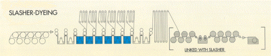Slasher Dyeing: Each yarn is laid beside one another across a cylinder or beam and each yarn moves through the dye process individually.