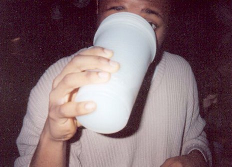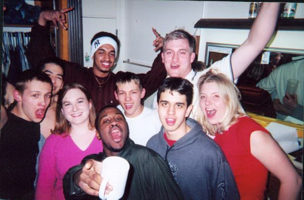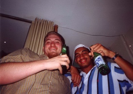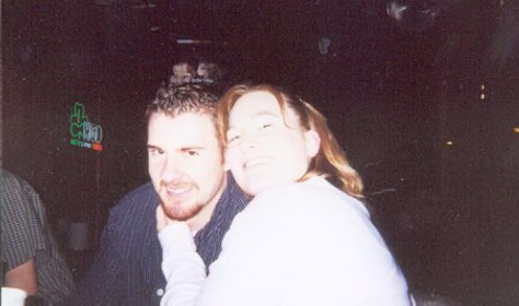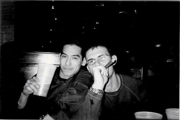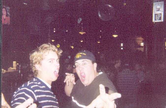 much time either at student health getting doctored up or lying uuuunconscious in a room that (blame Tex, Matt says) has the look of a UNICEF warehouse. Mountains of foodstuffs and laundry (clean and not), a ready to make bonfire of textbooks, a sink that has a five o'clock shadow and tunes eternally creeping out of hidden speakers. Tex really isn't from Texas, he's from Council-tucky, which is just a few miles north of my home. He's basically TFD's John Belushi, with a prodigal sense of chemistry and a weakness for smokes and tuna fish with hot sauce. Matt has the tendency to make any situation hilarious, he's the guy you want to listen to your stories and to stay away from sharp objects when you trash talk the 49ers or his sour lime drinks. If you praise the Michigan State basketball team he'll lose it. These guys are always trouble when they're out on the night, Tex usually injures himself spontaneously and Matt's right eye gets paralyzed after only so many. In other words Matt will forever be cleaning that room, and getting Marta's props.![]() ![]() Matt checking out life through the bottom of a stein Tex and me exchanging friendly hugs