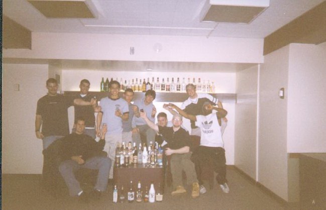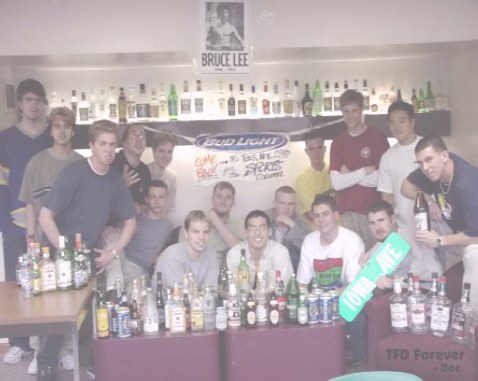 ![]() The Infamous TFD (aka Third Floor Daum, aka University of Iowa Men's Honors Floor, aka Most Troublesome Floor in all of Campus' Dorms). My freshman year was spent in this now infamous site, where I met some of the smartest, funniest and craziest people I will ever get the chance to know. From strangers into best friends, this place honeycombed young go-getters into groups that brought action to every part of the college experience. Troublemakers galore, property damage was excessive and reoccurring, but mostly it was comic in nature. We could always be seen traveling in packs to go eat, grumble to class or just to invade the bars. The level of nintendo and computer game playing was appalling, the decibels of music playing was deafening and the level of alcohol consumed (one semester's worth of liquor bottles above) was staggering. Through and through, fights broke out, feelings were hurt, the regurgitation club's numbers grew and many a heart was broken and donkey-punched; however, I've never seen a floor where most doors were unlocked and a few never closed, even when no one was home! I take pride in my TFD heritage, it's an acronym for some of the best memories and friends of this four year campaign.