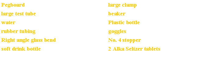 Two Alka -Seltzer tablets placed in the test tube will generate enough gas to fill the collection bottle. After adding the tablets, quickly put the rubber stopper in place and carefully insert the delivery tube into the top of the collection bottle. The carbon dioxide will force the air out of the test tube and the rubber tube so it will not be collected.