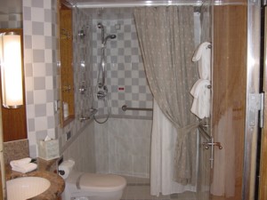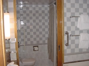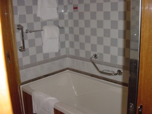 Here are some photos of a Cat 3 suite. Like Cats. 1 and 2, it includes concierge service. This one is a handicapped stateroom, so the bathrooms are a little larger than usual: