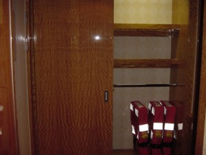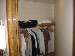 | The "livingroom" area. The entertainment center, with VCR and CD player, is at the far right, and the curtained "window" is one of the two doors to the verandah. | One of the two closets...this is the smaller of the two. |