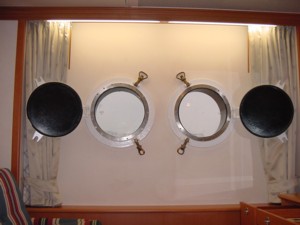 Most people think of a porthole as one large, round opening, and this is true in the staterooms on all decks, down to and including deck 2. But on deck 1, you get two smaller portholes. Here are photos for comparison: