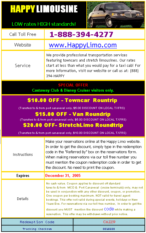 Click here or click coupon to go to Happy Limo's website. Follow instructions on coupon for your discount! If you want to see photos of Happy's stretch limo at Port Canaveral, click here.