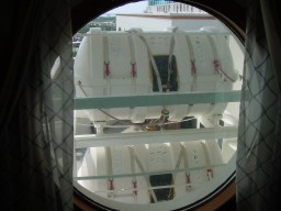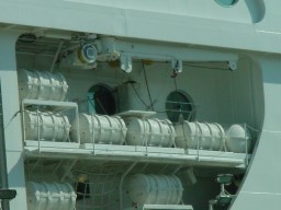 | The photos at right show the exterior location of the secret porthole rooms so you can get an idea of where they were located on the ship (note that this is the front of the ship). They are the rooms behind the barrels on the upper floor with barrels, next to the row of "regular porthole" rooms. | ![]() |