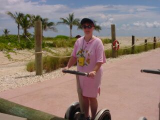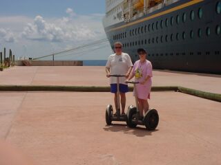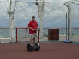 Disney was one of the first to offer ride rentals on "IT". On port days, sea days if the seas were not rough, you could ride it on the sports deck. (Photos "Courtesy of RickW and DanicaW"). When the ship docks at Castaway Cay, DCL has a larger pen set up on the island. The cost was $15 for 15 minutes when we rode in Sept. 2002. It is great fun to ride, the forward/reverse and speed/brakes are controlled with your toes. With the exception of the turning knob on the one handle, the stick has no function.