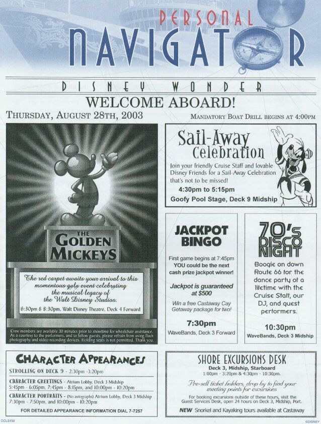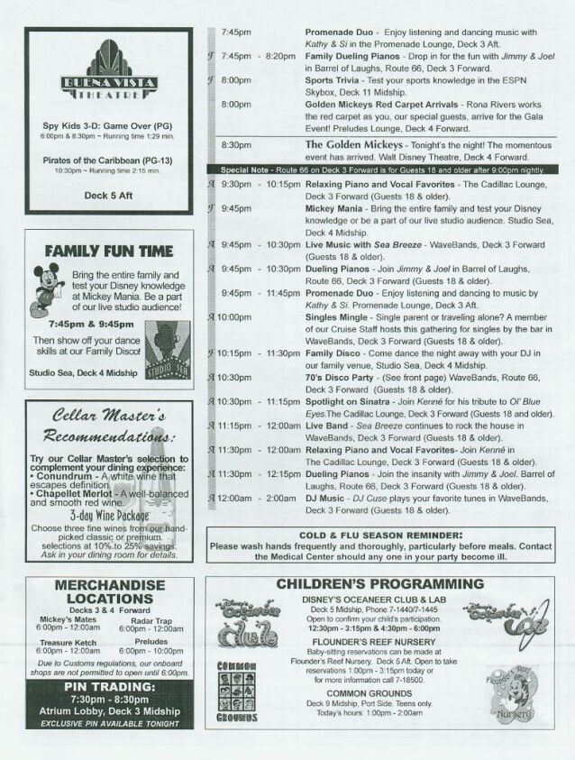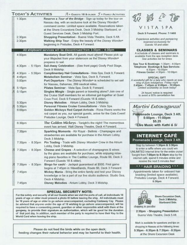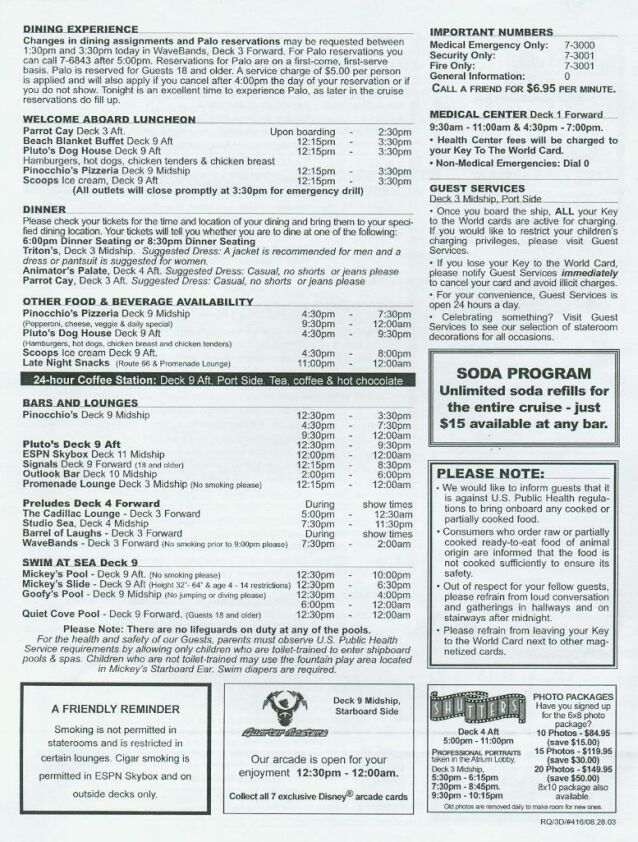 What can you do on Disney's 3-day cruise? From our 8/28/2003 cruise. They are in JPEG format and may not be readable on all monitors. Enjoy! NOTE: There are four pages for each day. Also, keep in mind that this is meant to be a SAMPLE of what MAY be going on during your cruise...Disney changes the times and activities frequently, so it is likely that your cruise will be somewhat different.