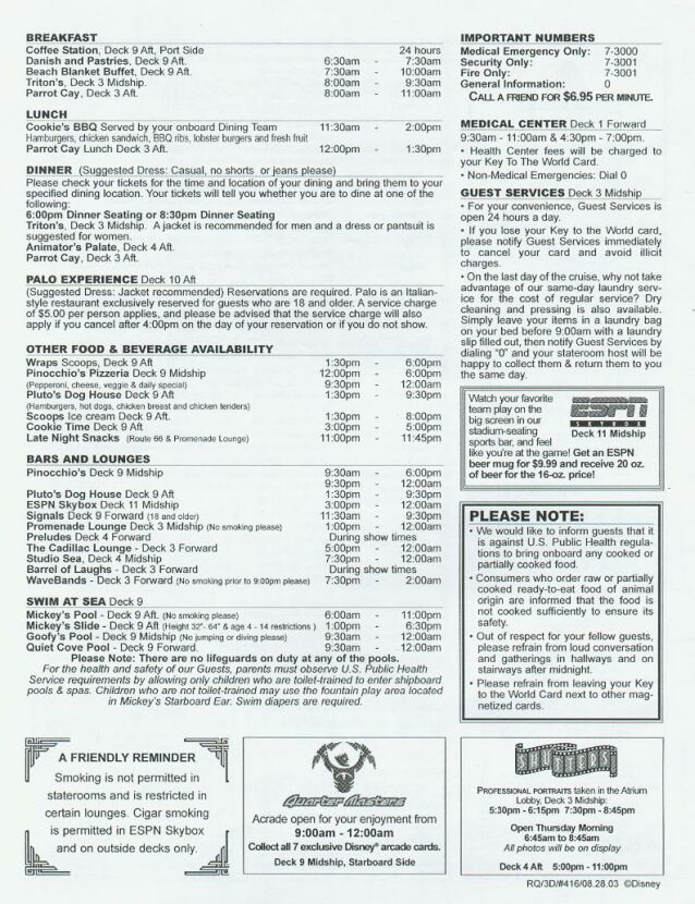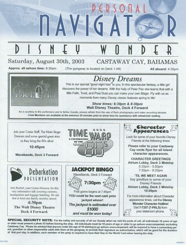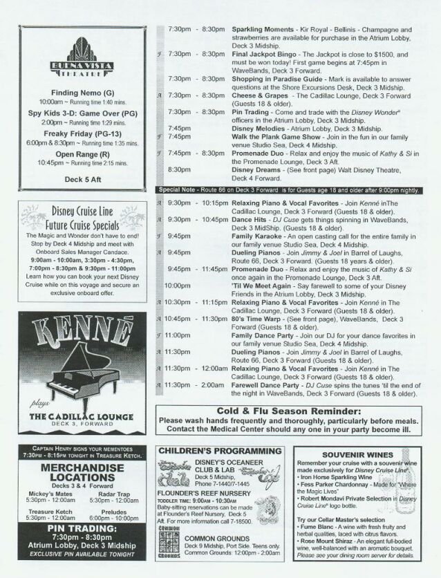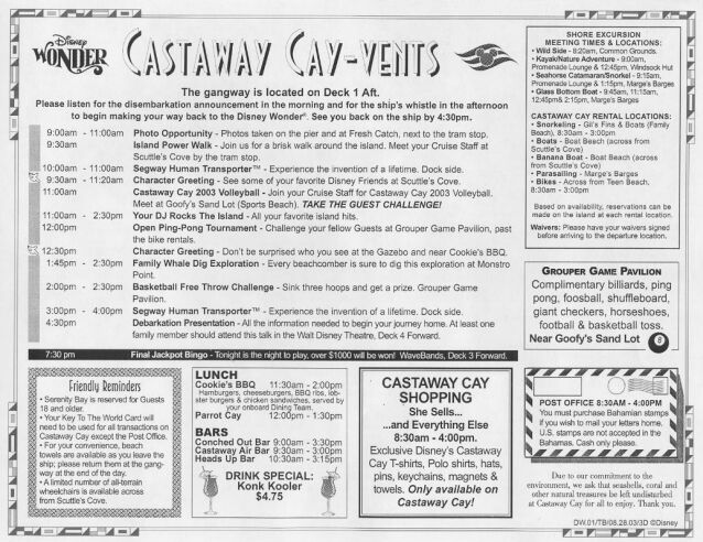 What can you do on Disney's 3-day cruise? From our 8/28/2003 cruise. They are in JPEG format and may not be readable on all monitors. Enjoy! NOTE: There are four pages for each day. Also, keep in mind that this is meant to be a SAMPLE of what MAY be going on during your cruise...Disney changes the times and activities frequently, so it is likely that your cruise will be somewhat different.