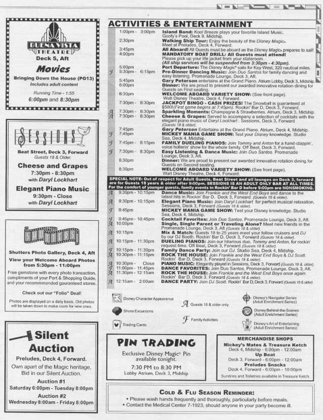 What can you do on Disney's new Western 7-day cruise? Courtesy of "The Canetti Family from New York" 7/5/2003 Western cruise. They are in JPEG format and may not be readable on all monitors. Enjoy! NOTE: There are four pages for each day. Also, keep in mind that this is meant to be a SAMPLE of what MAY be going on during your cruise...Disney changes the times and activities frequently, so it is likely that your cruise will be somewhat different.