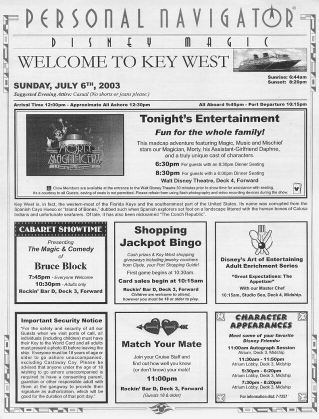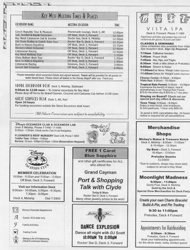 What can you do on Disney's new Western 7-day cruise? Courtesy of "The Canetti Family from New York" 7/5/2003 Western cruise. They are in JPEG format and may not be readable on all monitors. Enjoy! NOTE: There are four pages for each day. Also, keep in mind that this is meant to be a SAMPLE of what MAY be going on during your cruise...Disney changes the times and activities frequently, so it is likely that your cruise will be somewhat different.