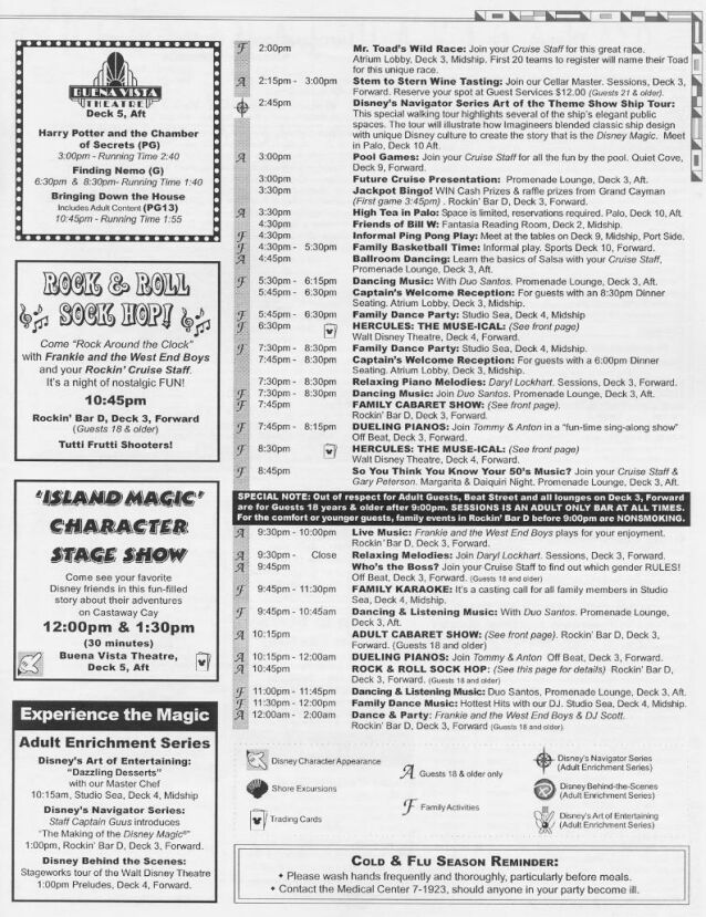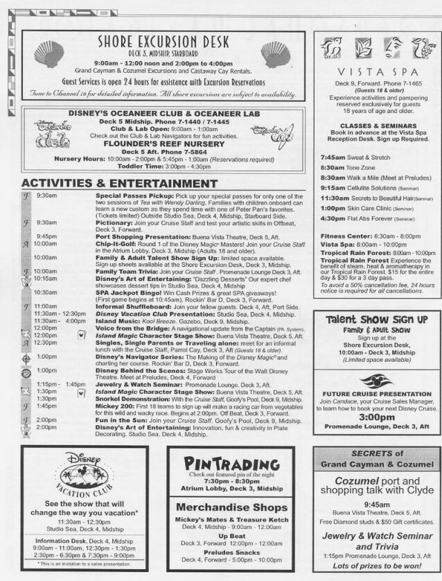 What can you do on Disney's new Western 7-day cruise? Courtesy of "The Canetti Family from New York" 7/5/2003 Western cruise. They are in JPEG format and may not be readable on all monitors. Enjoy! NOTE: There are four pages for each day. Also, keep in mind that this is meant to be a SAMPLE of what MAY be going on during your cruise...Disney changes the times and activities frequently, so it is likely that your cruise will be somewhat different.