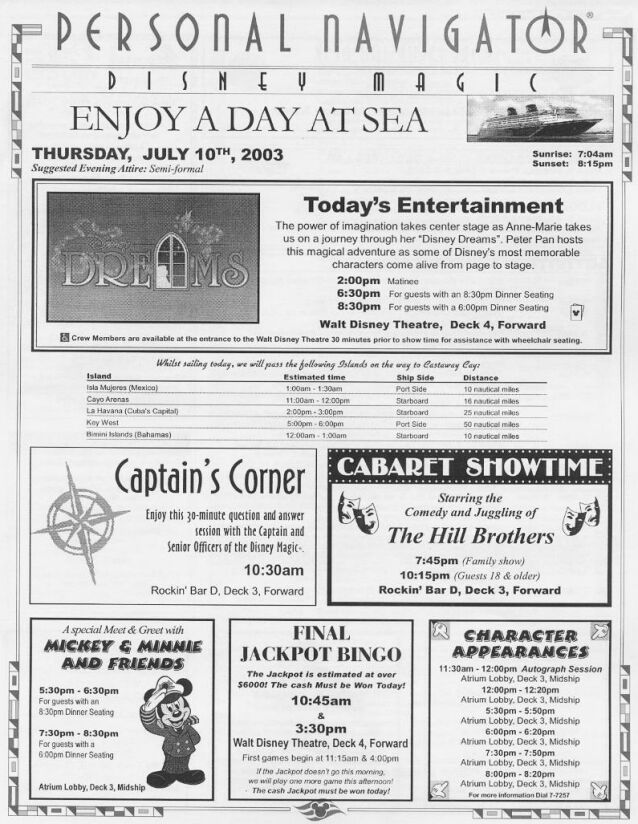What can you do on Disney's new Western 7-day cruise? Courtesy of "The Canetti Family from New York" 7/5/2003 Western cruise. They are in JPEG format and may not be readable on all monitors. Enjoy! NOTE: There are four pages for each day. Also, keep in mind that this is meant to be a SAMPLE of what MAY be going on during your cruise...Disney changes the times and activities frequently, so it is likely that your cruise will be somewhat different.
