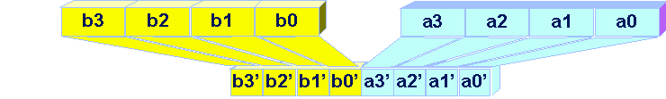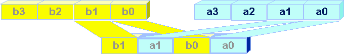Another frequent use of the Unpack instruction is the transposition of an array. When data are organized in memory in rows (a0, a1, a2, a3) for vector A, and similarly for vectors B, C, D, but the data parallelism is on the columns i.e. (a0, b0, c0, c0), a transposition is necessary to use the MMX instructions. Vectors A and B are interleaved as shown in the previous figure, similary Vectors C and D are interleaved.