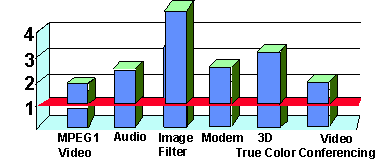The following chart (Figure 10) shows the application level performance benefits of MMX instructions. The different applications are represented along the x axis, the y axis represents the speed up of the application using MMX technology over the same application not using MMX technology in the same micro-architecture (PentiumTM Processor with MMX Technology). Speed up factors depends on two key elements: