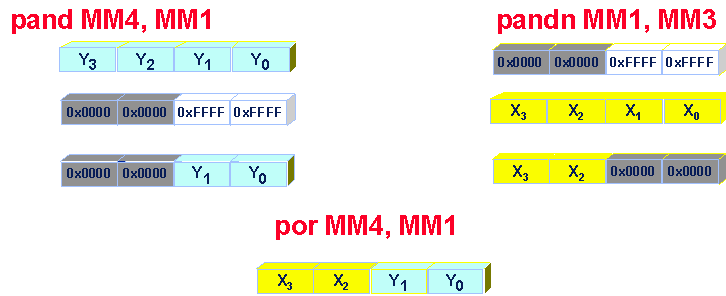 Saturating arithmetic is supported for 8-bit and 16-bit data, and for signed and unsigned data. For bytes, unsigned saturation is expected to be most useful for pixel operations. Wrap around arithmetic would cause pixels to become brighter and brighter, and suddenly jump to black when the wrap around happens. Clamping pixel values to the brightest color (FFh) is the most natural way to handle these cases. Similarly signed saturation is expected to be useful for operations on audio samples (typically signed 16-bit elements) where saturating at highest and lowest possible values is built in many algorithms. MMX technology supports a packed compare instruction. Given the constraint of not adding any new architecture visible state, this instruction could not return any new flags. The result of PCMP is a mask containing all 0s if the tested condition is false, and all 1s if the tested condition is true. (Figure 4)