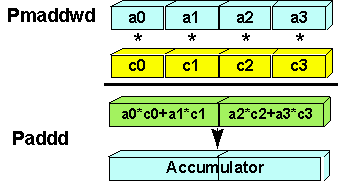 The PMADDWD instruction computes four 16-bit x 16-bit multiplies generating four 32-bit products, and then adds the first pair and the second pair of these products together. Figure 6 shows how the PMADDWD instruction operating in parallel on four elements of a vector can be used for a vector dot product computation. The result of the PMADDWD are added to the running accumulator of the inner loop by a PADDD instruction. The two elements of the accumulator need be added together outside of the inner loop to get the final result of the dot product