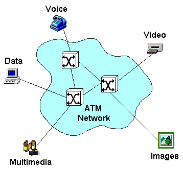 Figure 1: Different Types of Network Traffic Figure 1 illustrates different types of information accessing a network. There are different requirements for each type of information. Voice: In its digital form, voice communication comprises of a continuous stream of bits, grouped together to form packets. It has a constant bandwidth of 65kbps required for the entire duration of the call. Voice communication is isochronous, i.e. it is very sensitive to timing. The bits have to arrive at the receiver at exactly the same rate as they are transmitted. If they are received slower than transmitted, there will be a build up of packets and some will be discarded by the network. If they are received faster than transmitted, the receiver will run out of packets and there will be gaps in the conversation. Voice transmission is also sensitive to transit delay i.e. the time taken to traverse the network. A delay of greater than 50ms is noticed as a gap at the change over of speaker. Voice transmission is tolerant to minor errors. Each packet only provides a small part of the word and there is enough redundancy in speech that the conversation will still be understood if the occasional syllable is missing. It is not feasible to re-transmit a missing or corrupted packet because it would arrive too late. Video: Video data consists of a series of still pictures or frames displayed at a rate of 25-30 per second. Video signals usually contain a lot of redundancy since only a part of the picture changes from one frame to the next. The bandwidth required is variable, depending on the quality of the picture and the amount of compression used. Video transmission is sensitive to timing. It is not so sensitive to transit delay but is affected by jitter, i.e. variations in the transit time. Video conferencing is sensitive to transit delay, because transmission is in both directions. Uncompressed video containing redundancy is more tolerant of small errors. Retransmission of corrupted packets is not feasible. Video transmission requires the audio and video signals to be synchronised to within 120ms. Data: Data is `bursty' in nature, i.e. there are periods when there is little or no traffic and periods when the link is saturated. This results in a very variable bandwidth which is difficult to predict. Data transmission is not timing sensitive or isochronous. It doesn't even matter if the packets arrive out of order. It is not affected by transit delay, but it is very sensitive to errors and so corrupted or missing packets must be resent. Image: Transmission of images is very similar to data, except that there is a very large amount data per picture and so a higher bandwidth is required. Multimedia: Multimedia can be a combination of any of the above, depending on the application. It is usually very information intensive requiring a large bandwidth. Network TypesTelephone Plain Old Telephone Service (POTS) uses circuit switching techniques to connect users. The callers are physically connected and have a fixed bandwidth for the entire duration of the call. This type of network is ideal for normal telephone calls because the bandwidth required is low and it needs to remain for the whole call. There has to be a fixed and minimal delay in transmission with little loss of data. There are two types of POTS connections available: leased-line and dial-up. A leased line is a permanent, dedicated connection between two users. A dial-up connection requires the connection to be made before the call can take place and it exists only for the duration of the call. Circuit Switching Technology Communications over a public telecommunications network uses a point-to-point approach, physically connecting the two users together, as shown in figure 2. Switches and multiplexers interconnect the communications circuits allowing many users to share the network. Access to the network is achieved by simply plugging the computer, through a modem, to the telephone line. This type of connection has a fixed bandwidth for the entire duration of the call. This is required for speech, which is time sensitive, but it is inefficient for data transmission because nothing else can use the bandwidth during the idle times between data bursts.