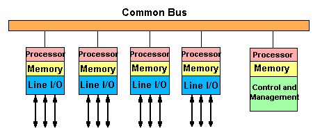 Figure 12: Bus/Backplane Switch In a bus switch (see figure 12), external links connect to the switch via an adapter card. The adapter card is really a miniature switch in itself because it performs all the switching and routing functions. Data is transferred between adapter cards on a bus. The advantage of the bus switch is:
