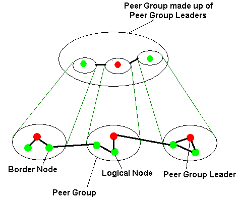 When a stream of bits (block of data to be switched) arrives at an input, the switching element uses the first bit received to determine which of its two output links will be used to forward the data. The bit used to determine the routing is discarded and the block is sent onward to the next switch stage where the process is repeated. At each switch stage there is minimal buffering of the data, resulting in a synchronous switching operation from end to end. The beginning of a cell is being output from the switch before its end has been received. The advantages of a Banyan switch are: The Banyan switch is simple, modular, expandable and uses minimal delay through it, however, it has the disadvantage that if two blocks of data passing through the switch at any time need to use a common link (switch output), then a collision occurs. This problem can be overcome by buffering the data in each switch element, causing a delay in the switch and increasing the transit delay in the network. The PNNI ProtocolThe Private Network-to-Network Interface (PNNI) protocol is used to establish, maintain and delete connections. The ATM switch converts the input VPI (Virtual Path Identifier) and VCI (Virtual Channel Identifier) to the output VPI/VCI pairs by using an appropriate routing table. ATM switches make their routing decisions according to the contents of the routing table. PNNI HierarchySwitches in an ATM network are arranged as a hierarchy of peer groups, shown in figure 14. Each switch in a group has an identical peer group identifier, which is assigned at configuration. Each switch in a peer group has an identical view of the group stored in its own topology database or routing table.