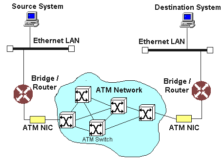 Figure 15: Ethernet to Ethernet Connection via ATM If an ATM user want to communicate with an ethernet user, it becomes more complicated. Firstly, the ATM machine needs to understand how to divide ethernet packets into cells. Secondly, there needs to be something to translate ethernet addresses into a form understood by the ATM network and vice versa. Thirdly, there needs to be some form of broadcast capability in both directions, since the higher level protocols will expect an ethernet-like network at the lower level. To solve these issues, the following steps are taken: