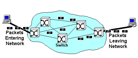 Figure 2: Circuit Switching Network Computer Network Packet-Switching TechnologyAnother type of network technology is called packet-switching technology (figure 3). In contrast to circuit-switching technology where a fixed line is established between the two parties, packet-switching technology simply splits the data into packets, adds an address onto each packet and sends it onto the network. Routers in the network examine the address and pass the packet on in the right direction, towards the destination. The destination system intercepts packets that are addressed to it. Each packet between two users may take a different route and take a different length of time to make the journey. This results in variable delays and packets arriving out of sequence. Packet switching technology is better than circuit switching for transmitting data because data is `bursty' in nature (i.e. there are periods when there is little or no traffic and periods when the link is saturated) and a fixed bandwidth is not required. It is also not time-critical and so it doesn't matter what route the packets take. By not tying up the bandwidth, other services can transmit data at the same time. It is not suited to speech and video because these forms of communication are sensitive to variable delays in the arrival of packets.