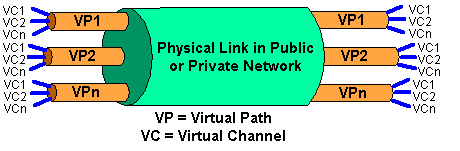 ATM protocols are standards-based, with co-ordination of ATM standards being performed by the ATM Forum. The ATM Forum is "an international non-profit organisation formed with the objective of accelerating the use of ATM products and services through a rapid convergence of interoperability specifications". There are many companies involved with the ATM Forum including Motorola, Microsoft, Nokia, AT&T, Mitsubishi, Ericsson, Sun Microsystems etc. A full list of members is available on their web page, http://www.atmforum.com/atmforum. ATM is a connection orientated technology, using a small, fixed size cell of 53 bytes, allowing very rapid switching through the network. Before data can flow between two nodes on an ATM network, a virtual path is set up between them. Virtual paths as shown in figure 6, are like pipes between switches within the network. Each pipe contains one or more virtual channels, each of which carries an individual data stream in one direction only. To set up a telephone call, for example, a virtual path is required with 2 virtual channels of 64kbps each, one for each direction. Each virtual channel has its own bandwidth and service requirements.