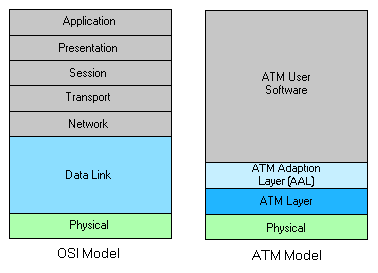 Figure 5: The OSI Reference Model To facilitate interoperability of subnetworks within an enterprise network, ISO developed a reference model for open systems interconnection, called the OSI reference model shown in figure 5. It's purpose was to provide a common basis for the co-ordination of standards development for the purpose of interconnecting open systems. Open systems are systems which are open to one another by virtue of their mutual use of applicable standards. The OSI reference model defines seven functional layers which are incorporated into each communicating machine. Each layer performs a different task, providing a service to the layer above. The way in which it performs its task is transparent to the other layers. Physical layerThe physical layer is the lowest layer in the OSI reference model. It deals with the actual transmission of a bit stream in the form of electrical, optical or radio signals, across a physical circuit between communicating machines. The physical layer refers to the permanent hardware installed in the communicating devices and the cables, connectors, modems etc. used in the physical network. Data Link LayerThis layer deals with the transmission of data units, or frames, between adjacent nodes in a network. It also handles the grouping of data into frames and synchronisation with respect to failures in the physical layer. It covers error detection and recovery mechanisms for transmission errors, flow control and frame sequencing. The data link layer refers to protocols such as ethernet and token ring for LAN's and ISDN, Frame Relay and ATM for WAN's. Network LayerThis layer handles the routing decisions and relaying of data packets from endpoint to endpoint through the network, regardless of how many intermediate data links need to be traversed. The IP part of TCP/IP is part of the network layer. Transport LayerThe transport layer is interested in end-to-end integrity controls to recover lost, out of sequence or duplicate packets. This and higher levels are only present in end systems. They are not required in intermediate switches. The TCP part of TCP/IP is in the transport layer. Other protocols represented by the network and transport layers include NetWares IPX/SPX and AppleTalk. Session LayerThe session layer and layers above it are associated with application programs as opposed to the network itself. The session layer organises the dialogue between the 2 application programs in the end systems and it manages the data exchanges between them. It establishes synchronisation points in the dialogue, so that the dialogue can be interrupted and resumed from a synchronisation point. Presentation LayerThis layer preserves the information content of the data transmitted over a network. It enables two systems to exchange information without being aware of the specific data formats each system uses. This means that each system can use own preferred format. Application LayerThe top layer of the OSI reference model deals with user processes. It is concerned with high level functions providing support to application programs using the network for communication. It provides the means for application programs to access system interconnection facilities to exchange information. The top three layers represent services such as printing, file services, e-mail, directory services, network management, ftp, telnet etc. It covers the software used to make the network transparent to the end user. What is ATM?ATM or Asynchronous Transfer Mode was originally designed to carry broadband ISDN for digital communications, but also offers a way to integrate all types of data transmission into the same architecture. ATM supports:
