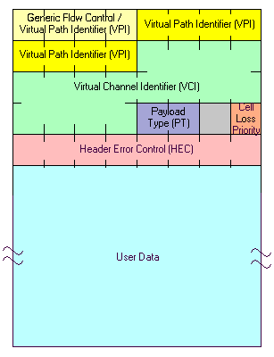 Figure 8: ATM Cell Structure The HeaderThere are two types of cell header: the user node interface (UNI) and the network node interface (NNI) (see figure 9). The UNI establishes calls and connects applications to the network and the NNI deals with two separate ATM networks communicating with each other. The private network node interface (PNNI) is the standard for interfacing the ATM switches of different vendors. The structure of the header is given below: Generic Flow Control (GFC), 4 bitsThis field is only used in the UNI. It is intended to be used to define a simple multiplexing scheme. Virtual Path Identifier (VPI), 8 or 12 bits This field is 8 bits in the UNI and 12 bits in the NNI. It is used to group virtual channels into paths for routing purposes. Virtual Channel Identifier (VCI), 16 bits This field identifies a particular channel within a virtual path.
