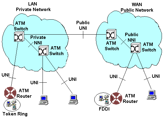 Figure 9: ATM Network Showing User-Network Interface (UNI) and Network-Network Interface (NNI) Payload Type (PT), 2 bitsThis field identifies the type of information in the user data field. Cell Loss Priority (CLP), 1 bitThis field is used to determine which cells can be discarded first when congestion occurs. Header Error Check (HEC), 8 bitsThis field contains an error detection and correction code used to correct single errors and detect double errors in the header of the cell. This prevents cells being delivered to the wrong end user. The User Data or Payload, 48 bitsThe payload of an ATM cell can be of any sort, as long as it can be encoded digitally. The delivery mechanism is independent of the type of data to be delivered. The circuit itself doesn't need to know what is in the cells, just where to get them and where to put them. Quality of ServiceThe ATM network defines Quality of Service (QoS) parameters based on the speed, accuracy and dependability required by the cells being delivered. There are different Quality of Service parameters because different types of information have different criteria, for example some data may tolerate delay but not loss of cells in the transfer process whereas other information e.g. real time video cannot tolerate delayed cells but accepts a certain amount of error or lost cells. The Quality of Service is negotiated by the network before a connection is set up. Once configured, the network will guarantee to give the agreed Quality of Service to the end user. The three most important parameters negotiated during the set-up of an ATM connection are: Peak Cell Rate (PCR)This parameter determines the maximum rate at any moment at which cells can be delivered across the circuit. If the rate increases beyond the PCR, the cells may be dropped along the way. Sustained Cell Rate (SCR)This parameter defines the continuous average rate that cells are available to pass through a circuit. Minimum Bit Rate (MBR)This parameter indicates the minimal amount of bandwidth that has been reserved for the circuit. If the source has nothing to deliver to the destination, empty cells will be sent instead to maintain the bandwidth. The parameters are used to define the following ATM Classes: Constant Bit Rate (CBR)This class provides a continuous isochronous stream of data traffic transmission of video of broadcast quality, and voice. This should give performance equivalent to comparable private lines. It is an expensive option since the bandwidth is guaranteed between two points even if the line is idle. When there is no data to send, the link will send idle or blank cells at the same rate, effectively still using bandwidth when it isn't necessary. Real-Time Variable Bit Rate (rt-VBR) and Non-Real-Time Variable Bit Rate (nrt-VBR) These services allow data to be delivered in bursts. Video conferencing is an example of an application using VBR. There is enough redundancy in the video signal that the loss of one frame wont noticeably affect the output. rt-VBR is more concerned with controlling the transit delay between the sender and receiver than nrt-VBR. Unspecified bit rate (UBR)Internet access uses UBR. This service does not specify the transit delay and it doesnt care if the cells are successfully delivered to the receiver or not. It leaves these things to higher level protocols, such as the Internet Protocol (IP). Available Bit Rate (ABR)This is similar to UBR in that it can vary the transmission rate of cells at any time, but it offers better quality of service guarantees. ATM Adaption Layer (AAL)The ATM adaption layer is the service that converts a particular data source into a particular type of ATM traffic, i.e. it handles the mechanics of setting up the quality of service required by the user. There are 4 classes defined: