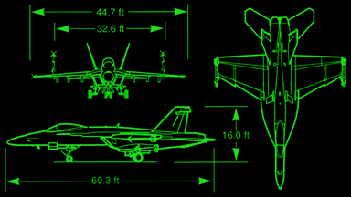 HEIGHT 15.3ft (4.6m) LENGTH 56ft (17.1m) WEIGHT 51,900lb (23,484kg) WINGSPAN 40.4ft (12.3m) EXTERNAL LOAD CAPACITY 13,700lbs (6,199kg) on nine hardpoint stations. CREW F/A-18 A,C & E One F/A-18 B & D Two Back