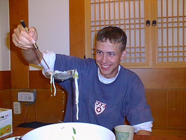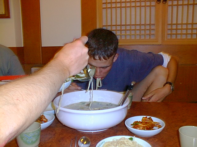 Dave's Arm and me eating soup and kimchi at a Korean restaurant in Seoul. Another dinner photo.
