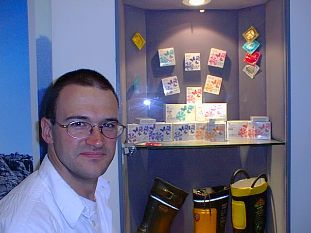 Christian is standing next to a wide selection of latex products form the Malaysian Pavilion at the Expo.