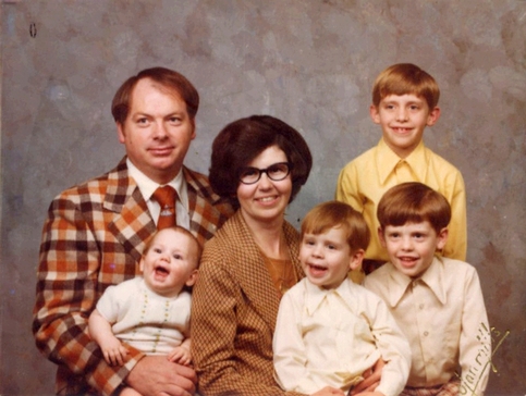 | This is a picture of the his family, before the great and marvelous hero was born. Gene, his father (holding Steven); Judy, his mother (holding Charles); Jonathan, standing behind James. Little did this urban family know that in just seven more years they would have amongst them a very conceted, perfect for running for Junior Class President, brown eyed, red/brown hair, curly tongue, and his magnificent uni-brow hero made for the job.
