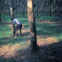 Plantaza kaucukovca: ako zarezemo koru kaucukovca curiti ce "mlijeko" od kojeg se dobiva prirodna guma.