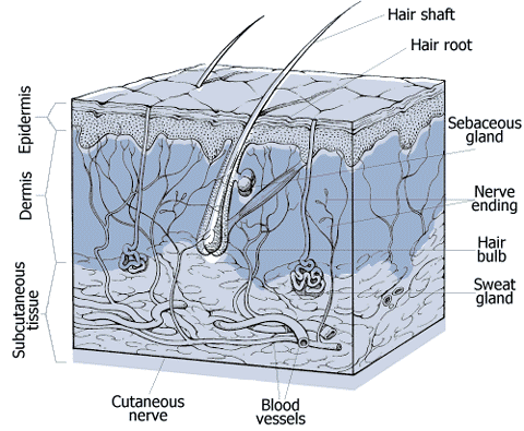 The skin--the largest organ of the body--is made up of a thin outer layer (called the epidermis) and a thicker outer layer (called the dermis). Below the dermis is the subcutaneous tissue, which contains fat. Buried in the skin are nerves that sense cold, heat, pain, pressure, and touch. Sebaceous glands secrete a lubricating substance called sebum. Deep within the skin are your sweat glands, which produce perspiration when you are too hot.