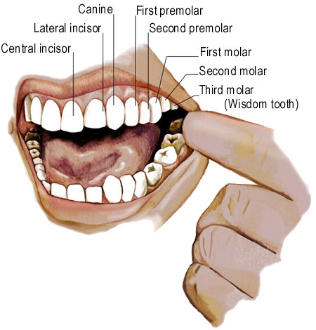 An adult has 32 permanent teeth. The incisors and canine teeth tear and cut food, and premolars and molars are used to grind and crush. The 4 back teeth are called the wisdom teeth (or third molars).