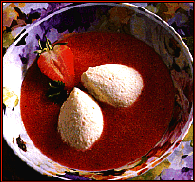 gelatine and mix well. Refrigerate until slightly set. Whip until smooth and add whipping cream to mixture. Refrigerate for 5 hours. Using 2 spoons, form dumplings and add to strawberry soup, decorate with fresh mint leaves. |