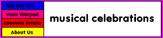 This website explores three major musical celebrations that happen in Australia. The Big Day Out is a festival for hard rock and alternative music. The Vans Warped Tour is a celebration of the surf/skate/punk culture. The Leeuwin Estate Festival celebrates a style of music that is less intense.