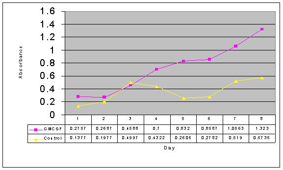 The number in the well represents the concentration of GMCSF (ng/ml) used. 83,000 cells/well were plated. One row was skipped between rows of cells.