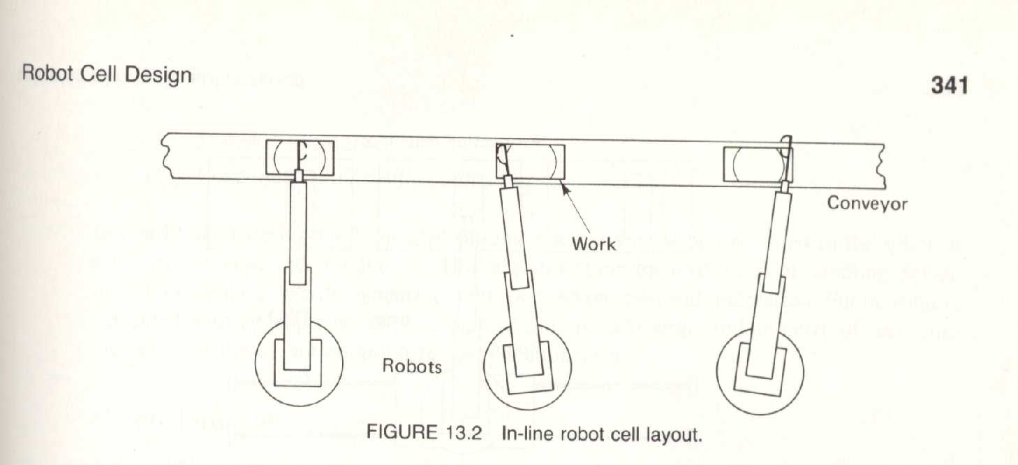Como se indico en el Capítulo 12, las aplicaciones industriales del robot comúnmente involucran varias piezas del hardware en adicción al robot Estos otros componentes del hardware incluye transportadores, paletas, herramientas de trabajo, mezclas, y otras. En algunas aplicaciones, varios robots deben integrarse en una célula sencilla de trabajo, es importante que el equipo en la célula este organizado en un esquema eficiente. Hay tres tipos básicos de célula de trabajo de esquema: