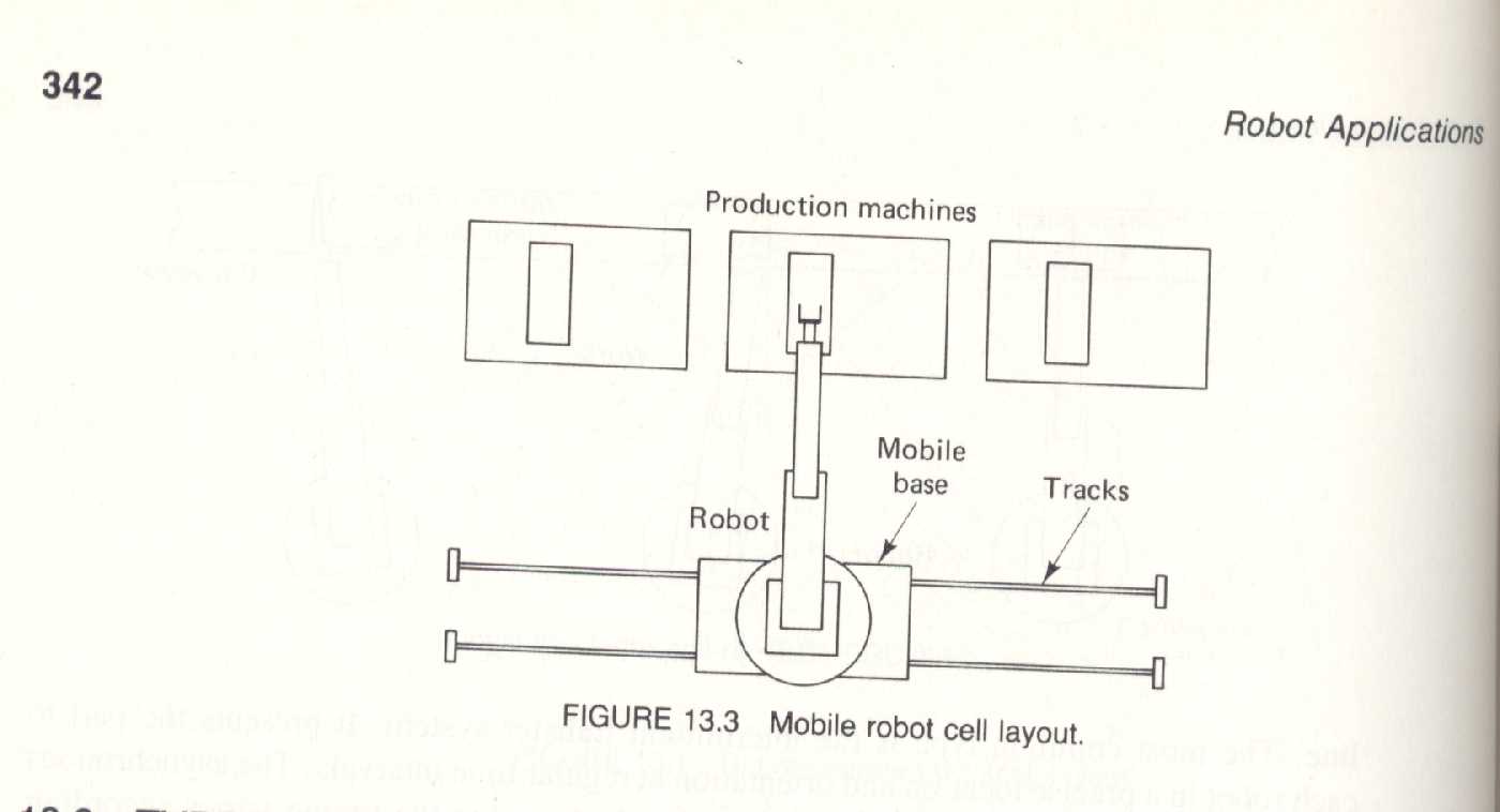 3.- Una posible conceptualización de este esquema de célula está presente en la Figura 13.3. En este arreglo, el robot se provee con medios siendo transportados dentro de la célula desarrollando diversas tareas a ubicaciones diferentes. El mecanismo de transporte consiste en un piso montado o sistema superior de carril que permite al robot ser movido a lo largo de una trayectoria lineal. La célula móvil de robot es apropiada en instalaciones donde el robot debe atender más de una de estación de trabajo (por ejemplo, una producción de maquinaría), y las estaciones de trabajo no pueden ubicarse alrededor del robot en un robot. Una razón posible es por qué el robot tendría que reubicarse por sí mismo en las estaciones de trabajo que son separadas geográficamente por distancias mayores a la capacidad de alcance des robot.