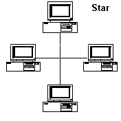 Each computer ina star network commmunicates with a central hub that resends the message either to all the computers (in a broadcast star network) or only to the destination computer (in a switched star network).