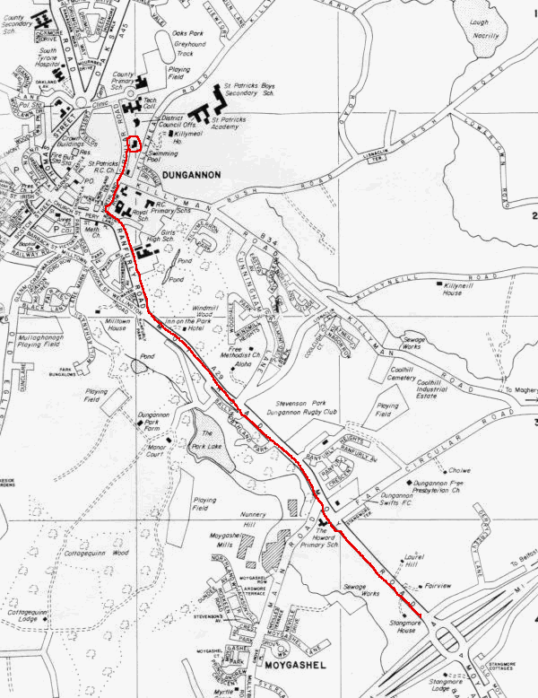 The map below shows the location of the venue (Dungannon Leisure Centre, circled in red) and the route (highlighted in red) to it from the motorway.