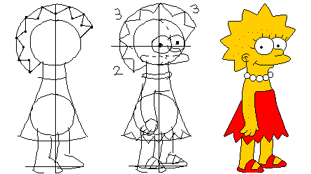 Lisa Lisa är en av de svåraste personerna att rita. Håret är som Maggies fast det står upp mer. Öronen är som de övrigas i familjen, ett c med ett böjt t i mitten. Lisa har fyra ögonfransar per öga som är lätt böjda. Den svåra biten är håret. Lisa har åtta "spikar" som är indelade i tre sektorer. Det skall vara tre spikar i de två övre sektorerna och två i den tredje. Lisas armar börjar där halsbandet slutar. Halsbandet skall ha fem synliga kulor. Klänningen skall ha sju flikar nedtill och täcka 2/5 delar av kroppen. Skicka in din teckning med E-mail om du blir nöjd. Lycka till! |