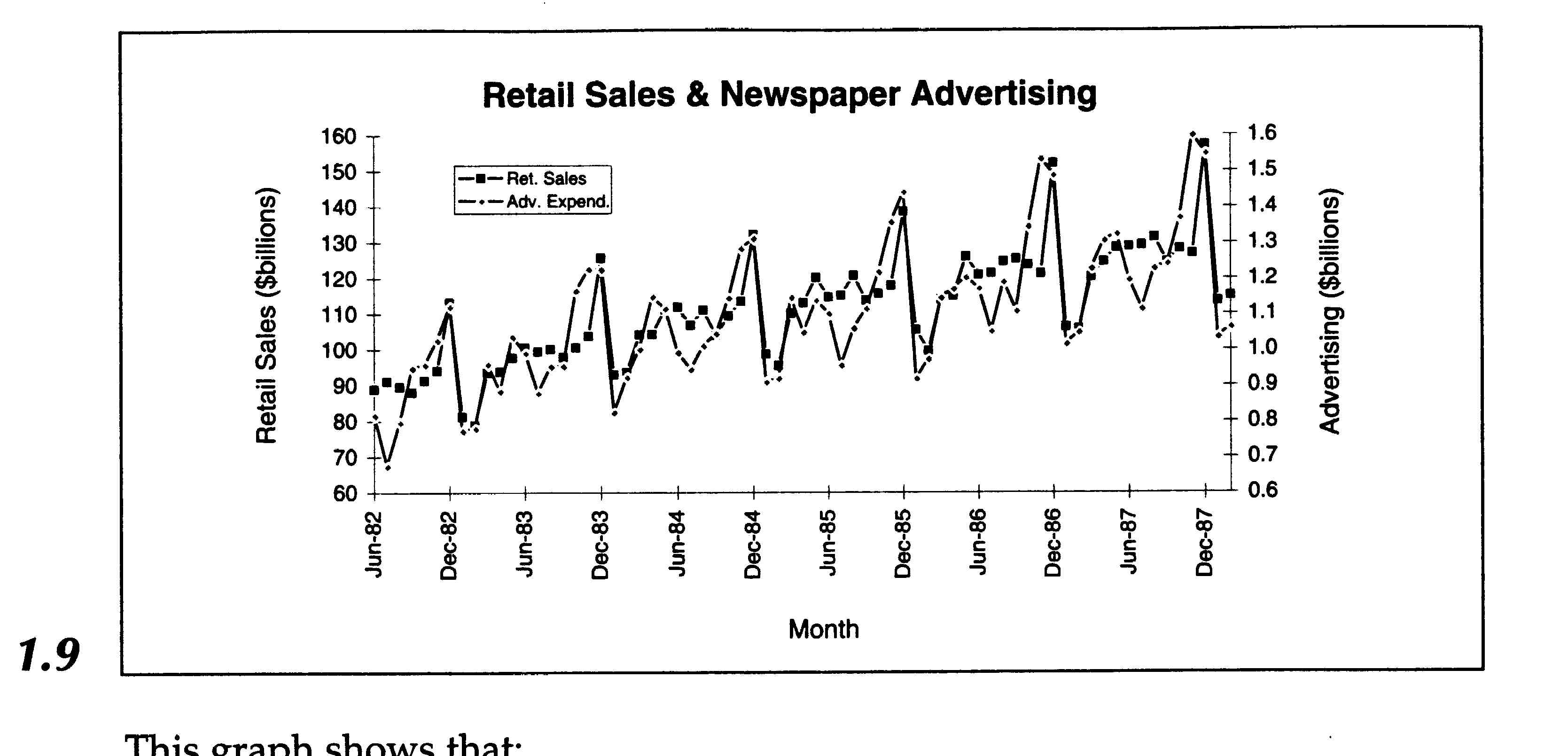 sales. Figure 1.9 shows both retail sales and advertising as time series,