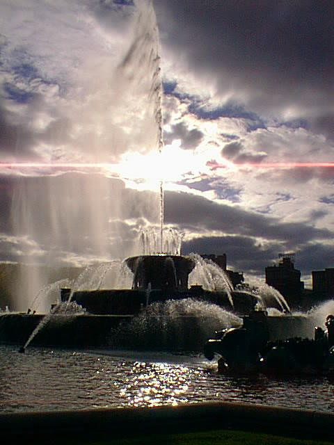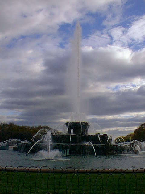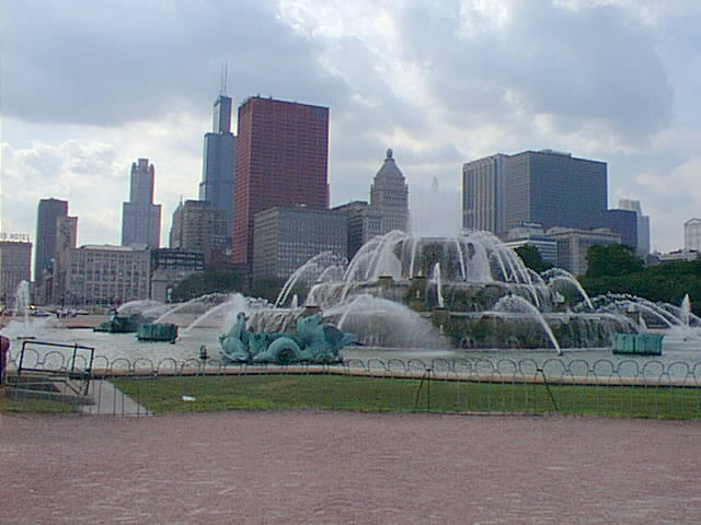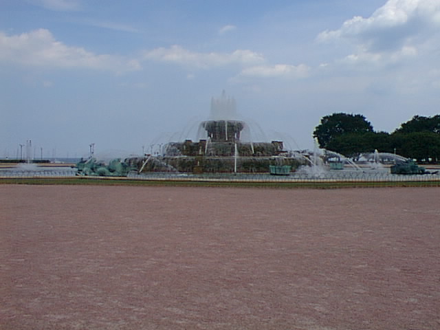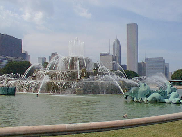 Chicago's Buckingham Fountain is truly a landmark in its own right. This view is looking from the city side towards the lake. The center fountain blasts a hundred feet straight up without warning about every 15 minutes during the summer months. The water falls like rain on unsuspecting parkgoers during windy days.