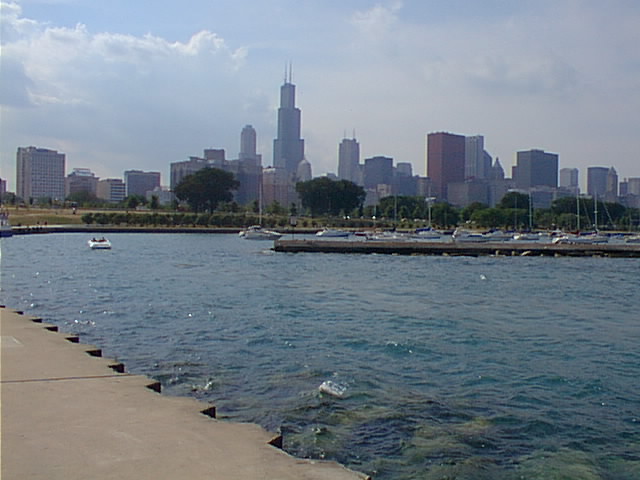 This breakwater is at the southernmost edge of Monroe Street Harbor. In the splendor of a warm summer afternoon. Sears Tower is the tallest building centered in the background.