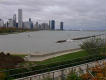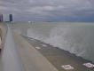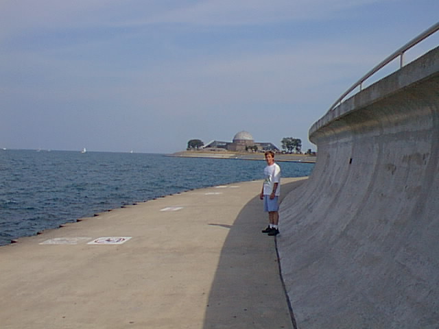 This view looks back the other direction. In the distance you can see the Adler Planetarium. This 'sea wall' curves upward and back out to splash the waves energy back out in case of violently bad weather.
