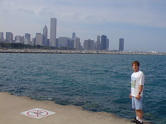 Squinty Me in the bright July sunshine. Across this stretch of lake is the Monroe Street Harbor. Standing just in front of the Shedd Aquarium along the hardened shore break.